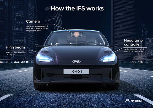 Broadly speaking, the IFS functions in three steps. First, the forward-facing camera in the top of IONIQ 6’s windshield detects the position of vehicles ahead and sends the location and angle info to the headlamp controller. Second, the headlamp controller calculates the ‘disturbance zone’ in which the other drivers’ visibility will be diminished and designates the corresponding LED lights among the headlights’ 16 IFS segments.