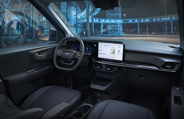 The “digiboard” instrument panel contains a 12-inch digital cluster and 12-inch centre touchscreen with Ford’s latest SYNC 4 system. Subscription-based Connected Navigation can boost productivity and reduce driver workload with updates on traffic, parking, charging and local hazards. Wireless Android Auto and Apple CarPlay compatibility is standard. An innovative, class-unique Office Pack includes a foldaway flat work surface and lighting to make using a laptop, filling in paperwork or taking a break in the cab easier and more comfortable.