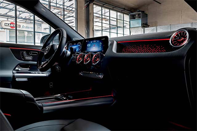 With a newly designed black panel surface with its star pattern at the front, the EQA and EQB visually catch up with their larger model siblings. A light band connects the daytime running lights of the headlights while a new bumper emphasises the broad effect of the vehicle front. The designers have also changed the insides of the taillights. The innovations in the interior include the current-generation steering wheel with touch control panels as well as the trim in brown lime open-pore wood, Mercedes-Benz pattern and backlit Mercedes‑Benz pattern.