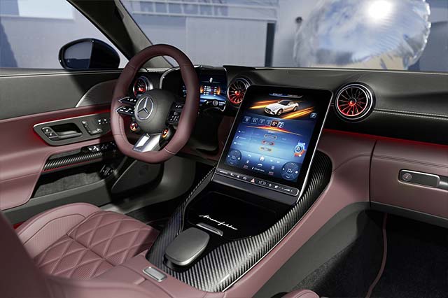 The active aerodynamics were also fine-tuned. It is adapted to electrified drive technology. The active aerodynamic element, which is hidden in the underbody in front of the engine, contributes to balanced driving behaviour. It is standard on the SL top model. This carbon profile is an exclusive AMG development and protected by patents. It reacts to the position of the AMG driving programmes and automatically extends downwards by around 40 millimetres at a speed of 80 km/h. This creates the so-called Venturi effect, which additionally sucks the car onto the road and reduces the lift on the front axle.