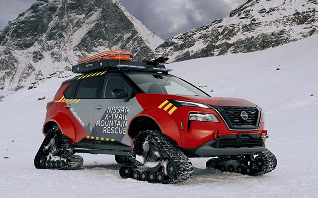 The modifications to the X-Trail Mountain Rescue include the replacement of the wheels with snow tracks, giving confident traction on slippery pistes, while the rear seats have been removed to allow the installation of a stretcher, to allow the transportation of injured skiers to the nearest medical facility, and a seat for a medical professional.