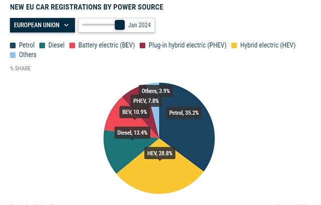 In January, battery electric cars accounted for 10.9% of the market share (up from 9.5% in January 2023), while hybrid-electric cars commanded a share of nearly 30%, solidifying their position as the second most preferred choice among EU car buyers. The combined market share of petrol and diesel cars totalled almost 50% in January 2024, marking a decline from 54% one year ago.