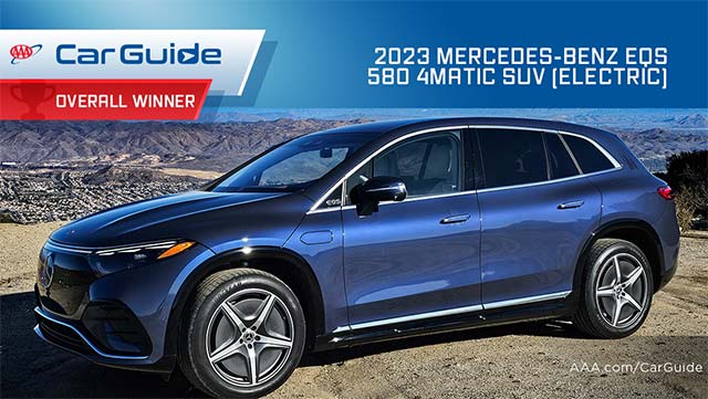 AAA awarded the 2023 All Electric Mercedes-Benz EQS 580 4MATIC SUV with the overall top score for the 2024 Car Guide. This year, all category winners are either electric, plug-in electric hybrids or hybrids.