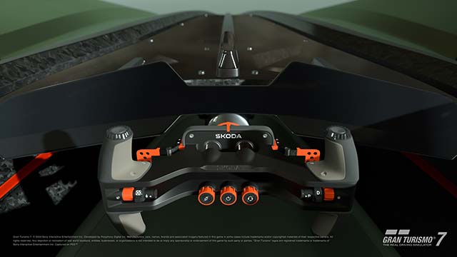 The low, elongated body of the Skoda Vision Gran Turismo gives the car a very modern and futuristic appeal. The sleek and dynamic exterior of the concept study features sharply drawn lines and clearly defined edges. Active aerodynamic components, for example on the striking Skoda-designed split rear wing, dynamically adapt to the driving conditions. This ensures outstanding handling and – in conjunction with four electric motors – a perfect ratio of performance and efficiency. Gamers can choose between two different paint finishes for their Skoda Vision Gran Turismo: one that evokes the famous Skoda 130 RS, celebrated for its double victory in its class at the 1977 Monte Carlo Rally, and a second in matte Explorer Green, emblematic of the Skoda Vision 7S concept car which introduced the brand’s new Modern Solid design language.