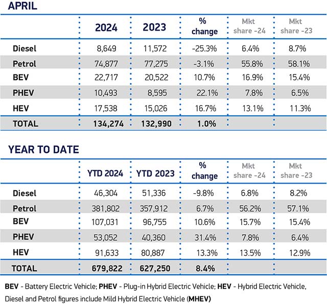 UK new car registrations grew for the 21st consecutive month in April, rising by a modest 1.0% to reach 134,274 units, according to the latest data published by the Society of Motor Manufacturers and Traders (SMMT). As a result, this was the market’s best April since 2021, although uptake was still -16.6% below the pre-pandemic level in what is traditionally a low volume month following the March plate change.