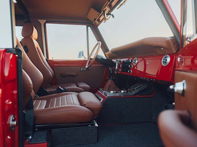 Every EV Bronco also features full LED lighting; keyless entry; power windows and locks; heating, defrost, and air conditioning; dual cupholders; and removable carpeting. Behind the seats is a wood bed floor with a modular cargo tie-down system.