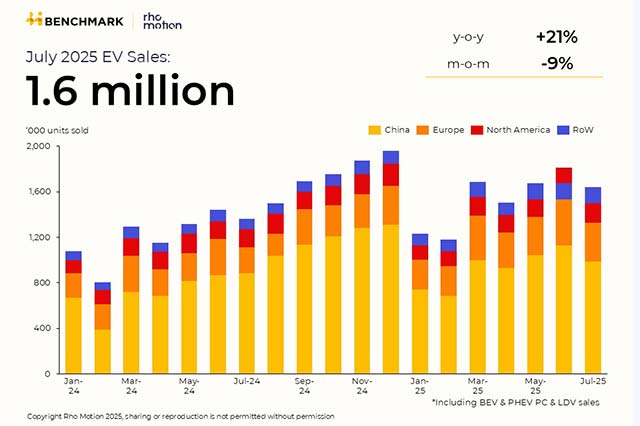The number of electric vehicles sold globally in July is 1.6 million, according the data revealed by leading EV supply chain research and insights company Rho Motion. This represents a 21% increase compared to July 2024, but a 9% decline from May 2025.
