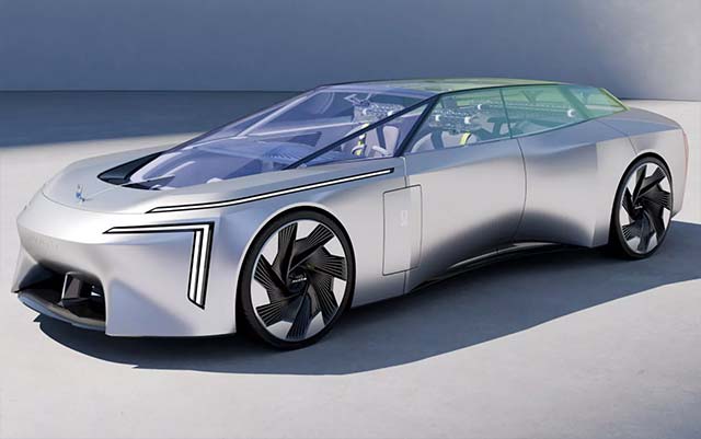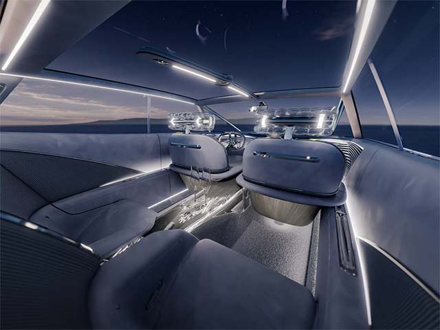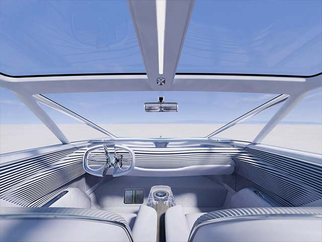 At the heart of the dashboard is a central element called the “vortex,” which houses a “living AI entity” designed to interact with the car’s occupants. For the interface, a circular “cortex” on the center console blends touch and gesture controls. The design team even created custom champagne glasses and carry-on accessories to match the car’s interior.
