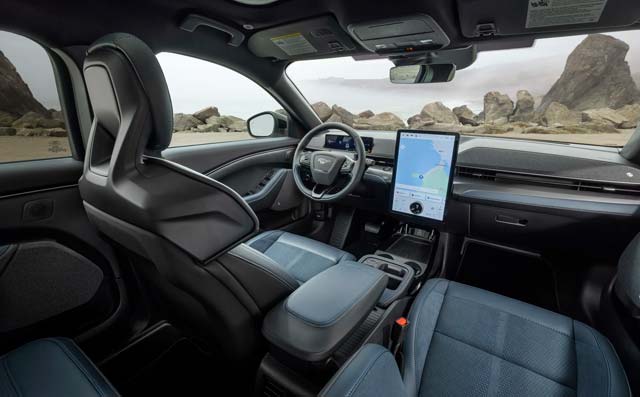 But the interior is what sets the Mustang Mach-E GT California Special apart: Performance seats are upholstered in Navy Pier ActiveX and Miko material with reflective blue and silver stripe.