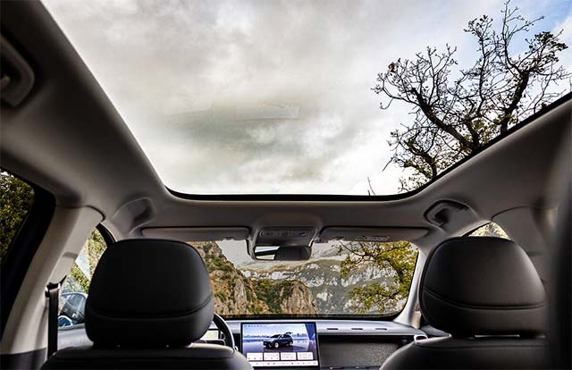 The Leapmotor B10 is available in two trims. The LIFE version is generously equipped with a 1.8 m² panoramic glass roof with electric sunshade, 18″ alloy wheels, a 360° parking camera, and a complete ADAS package.
