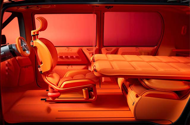The orange colour also predominates in the interior. Like every Citroen, the interior is designed as a regenerating living space, dedicated to comfort and serenity. The C-Zen Lounge is characterised by its architectural choices, features and materials. The interior has been designed as a space that is both welcoming and functional, making the most of its unique architecture. The driving position is distinguished by the absence of a dashboard, creating a unique feeling of space. In its place is a steering column that houses the entire user interface, framed by storage areas. In a nod to Citroen’s history, the single-spoke steering wheel has been reinterpreted using 3D textile printing technology. The cabin walls feature three-dimensional storage compartments inspired by the world of sportswear, while the seats, designed for optimal modularity, feature the brand’s iconic “chocolate square” pattern in their foam padding.