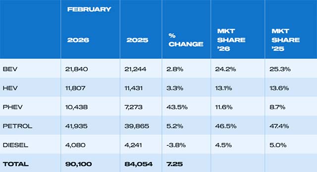 Battery electric vehicles (BEVs) continued to grow in volume terms, rising 2.8% to 21,840 registrations. That equates to a 24.2% market share — nearly one in four new cars sold in February.