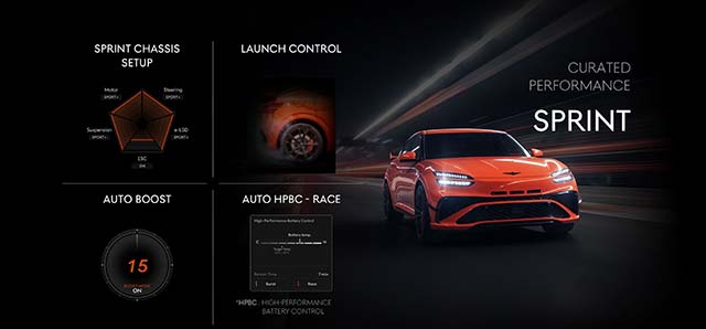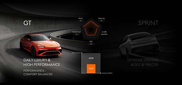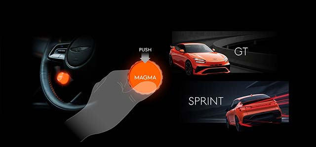 Sprint Mode, on the other hand, transforms the GV60 Magma into a performance-focused machine. Steering, suspension, motor output, and the electronic limited-slip differential (e-LSD) are all adjusted to their most aggressive settings. Traction is maximized through precise front-to-rear power distribution, delivering sharper handling and a more dynamic driving feel.