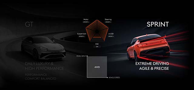 GT Mode strikes a balance between comfort and performance. Acceleration is tuned for smooth, refined delivery, making it ideal for long-distance cruising at high speeds. Meanwhile, the electronically controlled suspension ensures stability without sacrificing ride comfort. All-wheel-drive calibration and optimized power distribution further enhance efficiency and driving range.