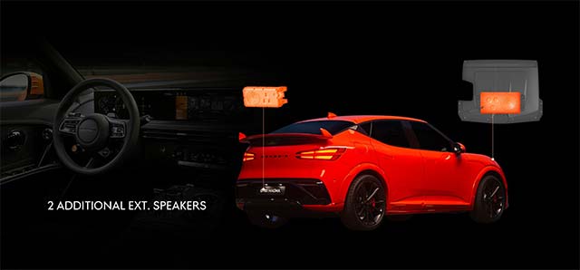 Using additional external speakers positioned at the front and rear, the system projects dynamic audio profiles that align with the vehicle’s performance characteristics.