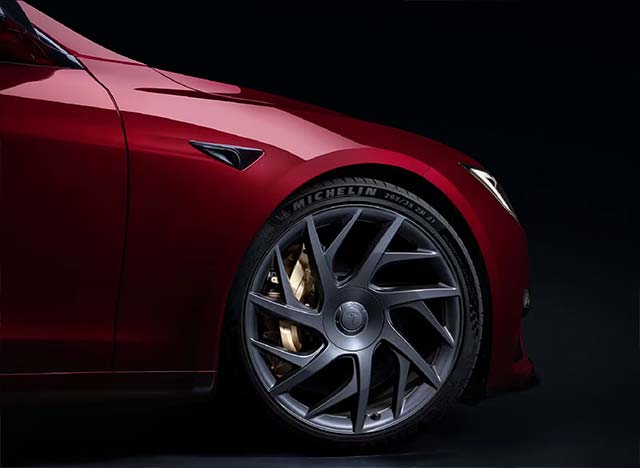 The Model S Signature keeps its blistering 1.99-second 0–60 mph time, 200 mph top speed, and EPA-estimated range of 309 miles. It also comes fitted with 21-inch Velarium wheels, carbon ceramic brakes, and gold brake calipers.