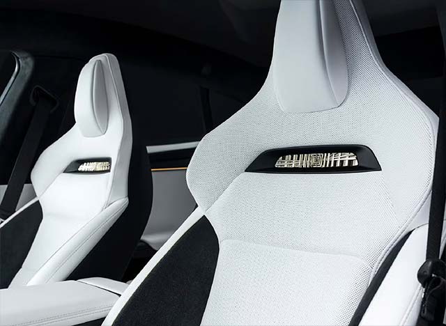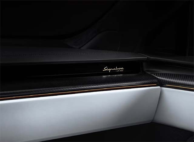 Inside, both vehicles feature a White Premium Interior with gold-themed Plaid details. The cabins include Alcantara trim, gold piping, gold Plaid seat badges, Signature-branded door sills, and a numbered dash plaque that identifies each vehicle’s place in the production run.