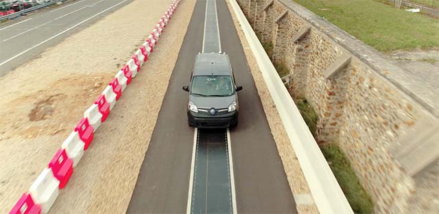 Renault has partnered with Qualcomm Technologies and Vedecom in designing a DEVC system capable of charging an electric vehicle dynamically with a charge of up to 20 kilowatts at speeds up to, and in excess of, 100 kilometers per hour. The DEVC system has been designed to support real-world implementation of dynamic charging. The two Renault Kangoo Z.E. vehicles can pick up charge in both directions along the track.