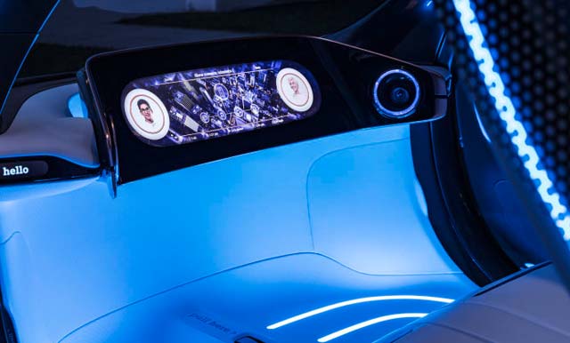 The show car is the first of the Daimler Group’s vehicles to take the logical step of dispensing with the steering wheel and pedals. The vehicle functions are controlled via personal mobile device or voice input, an arrangement that is intuitive, convenient and hygienic. Dispensing with conventional control elements makes the white interior appear even more spacious. The dashboard is replaced by a 24‑inch (58.5 x 15.6 cm) screen which is surrounded by a rose gold-coloured frame. The outer edges feature two smaller displays (four-inch), which can be used by the smart vision EQ fortwo for example to say “Welcome”.